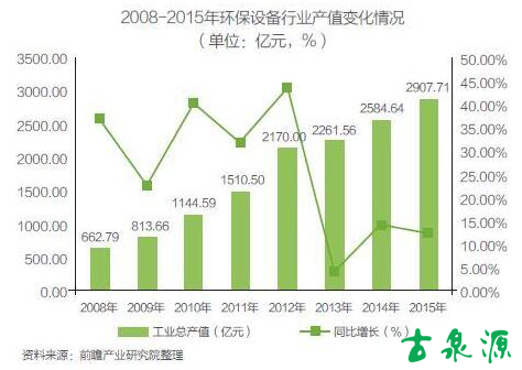 據(jù)前瞻產(chǎn)業(yè)研究院《中國環(huán)保設(shè)備行業(yè)市場前瞻與投資分析報告》顯示,2008-2015年,環(huán)保設(shè)備行業(yè)總產(chǎn)值逐年增長,年均復(fù)合增長率達到23.52%,但其增速波動較大。2015年,環(huán)保設(shè)備行業(yè)產(chǎn)值達到2907.71億元,較上年同期增長12.50%,增速較上年減少1.79個百分點。