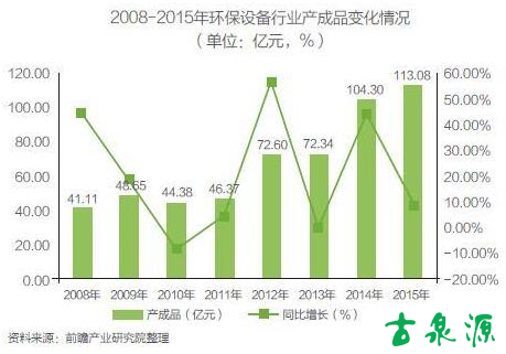 從行業(yè)產(chǎn)成品來看,2015年,環(huán)保設(shè)備行業(yè)產(chǎn)成品達到了113.08億元,相比上年上漲8.41%。2008年到2015年,環(huán)保設(shè)備行業(yè)產(chǎn)成品從41.11億元增長到113.08億元,年均增長率達到15.55%。